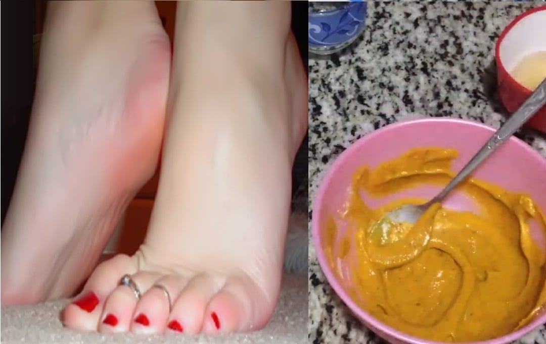 نخلط عصير الليمون مع الكركم، ونحركه جيدا حتى نحصل على مزيج متجانس. نضع المزيج على القدمين، ونتركه لمدة نصف ساعة، ثم نغسلهما بالماء الفاتر، ونكرر استخدام هذه الوصفة مرتين كل أسبوع.