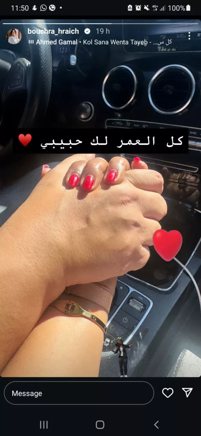 وقد اختارت بشرى أن تعبّر عن حبها بكلمات مختزلة وعميقة، حيث نشرت صورة تمسك فيها بيد زوجها، وأرفقتها برسالة قصيرة جاء فيها: