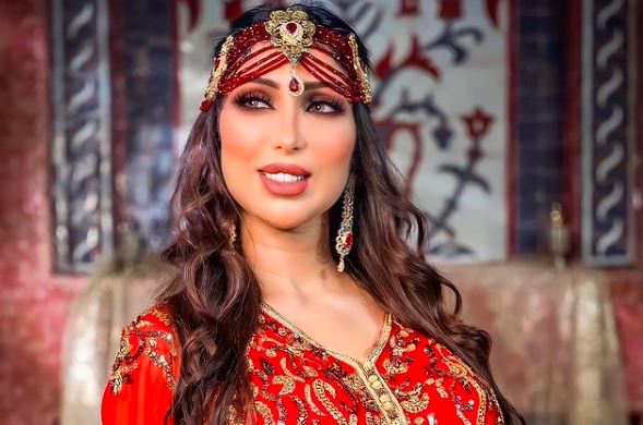 ونسقت مع القفطان اكسسوار مميز فوق رأسها وهو مصمم بسلاسل من الخرز الأحمر وفي وسطه وعلى الاطراف اكسسوارات ذهبية ضخمة وثمينة ونسقت معه اقراطاً ذهبية طويلة وضخمة ومزينة بأحجار حمراء أيضاً.