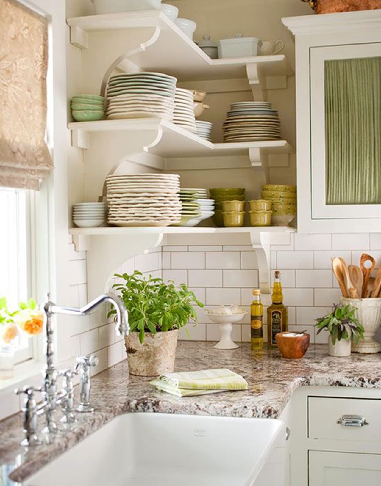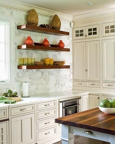 يمكنك استغلال المساحات الصغيرة في المطبخ باعتماد الأرفف سواء على الجدران أو حتى في الأركان حيث تكون مثلثة وتتماشى مع ديكور المطبخ وتفيدك في ترتيب المكان وأيضا منحه الرونق الجذاب.