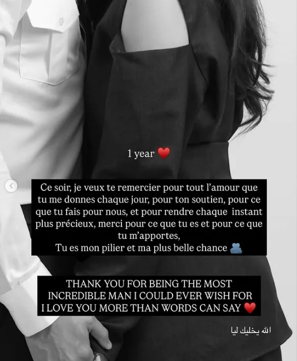 “بعد سنة في هذا المساء أود أن أشكرك هلى كل الحب الذي تقدمه لي كل يوم على دعمك على كل ما تقوم به لتجعل كل لحظة مميزة في حياتنا،شكرا لما تقدمه لي.أنت سندي و حظي السعيد في الحياة”