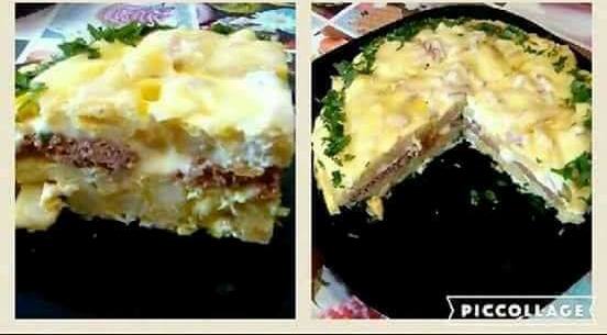 و نديرو الطبقة الاولى بطاطس وبيض و نزيدو الطبقة الثانية فرماج ستيك و نزيدو طبقة اخرى كراتان البطاطس بالبصل و البيض