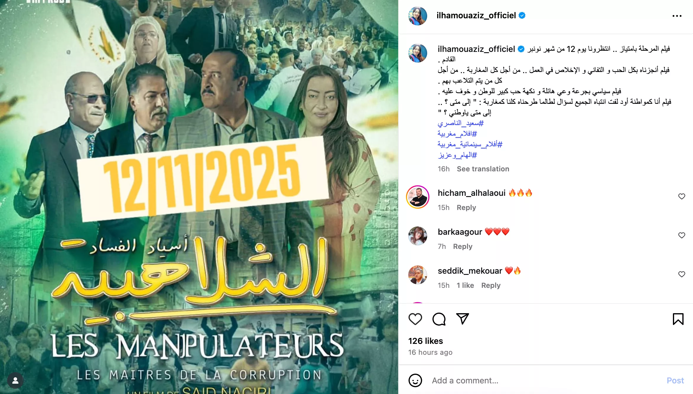 وكتبت إلهام في منشورها: “فيلم المرحلة بامتياز، انتظرونا يوم 12 من شهر نونبر القادم في فيلم أنجزناه بكل الحب والتفاني والإخلاص”، معبرةً عن فخرها بهذا العمل الذي يضم نخبة من الأسماء الفنية المرموقة.