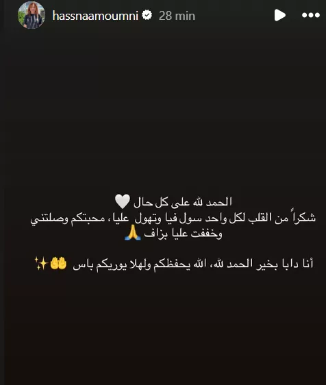 لم تتأخر الفنانة في طمأنة جمهورها، ونشرت رسالة عبر خاصية “الستوري” على إنستغرام، عبرت فيها عن امتنانها العميق لكل من سأل عنها، قائلة إن رسائل الدعم والدعوات التي توصلت بها كان لها أثر كبير في التخفيف عنها، وأكدت أنها “بخير وتتحسن”، مطمئنة الجميع على وضعها الصحي.