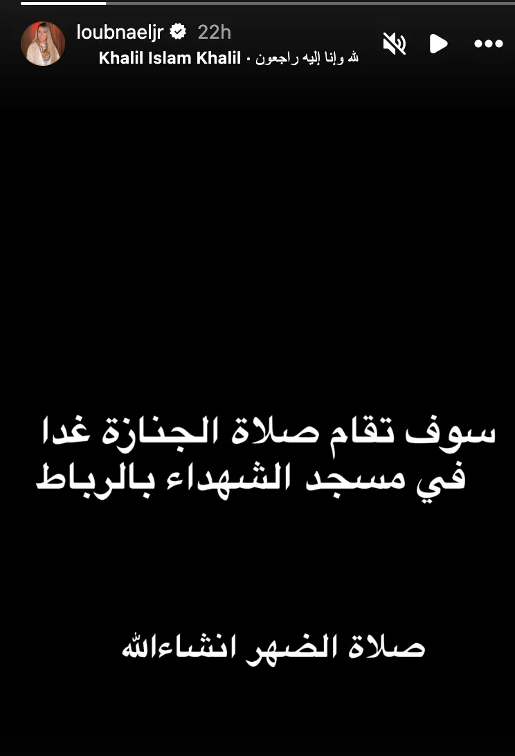 نشرت لبنى منشورًا عبر خاصية الستوريّات تضمن صورة كُتبت عليها عبارة “إنا لله وإنا إليه راجعون”، مرفقةً بتعليق جاء فيه: “خالتي ربيعة الجوهري في ذمة الله”.