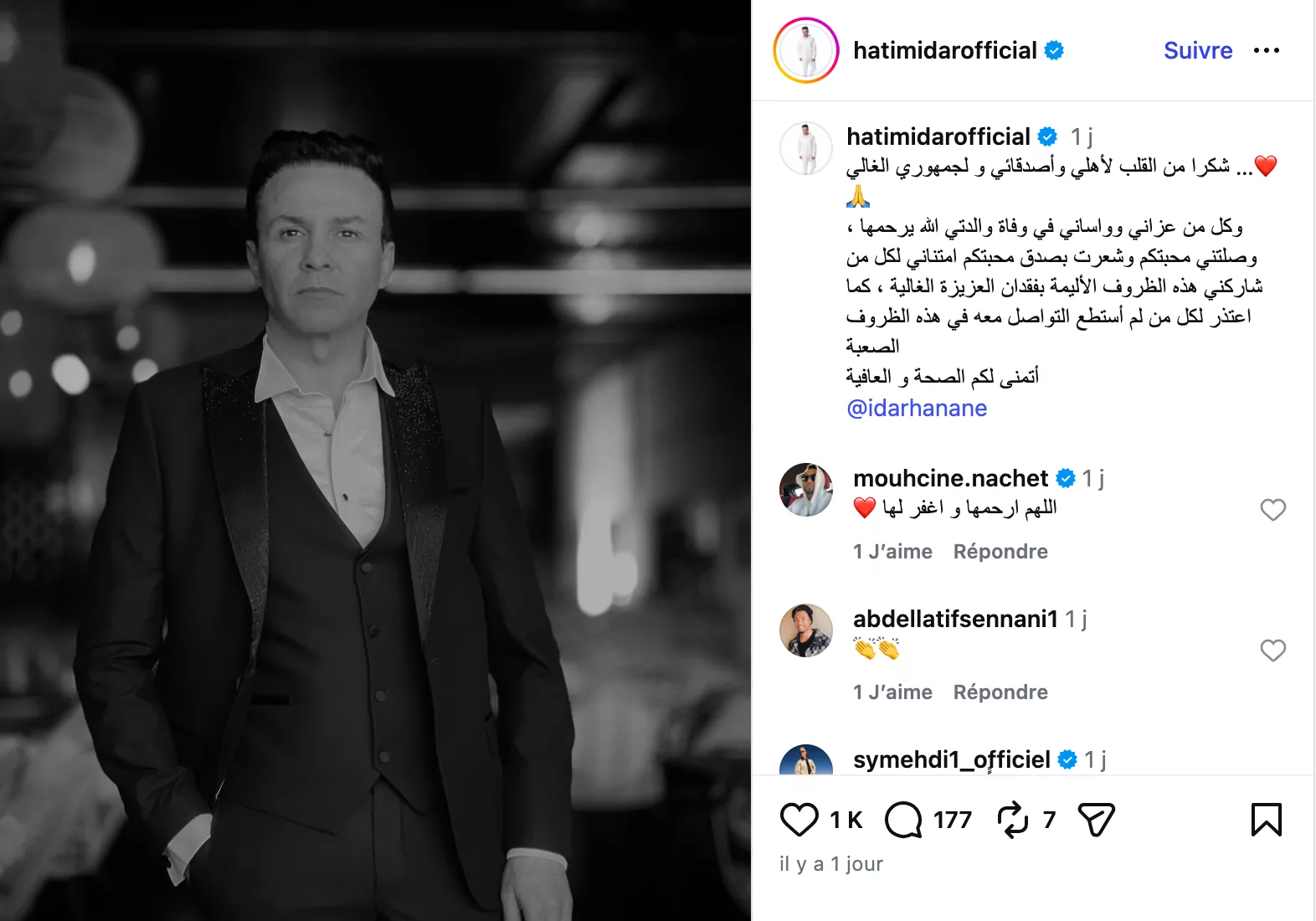 بعد أيام من الفقد الأليم الذي ألم به، خرج الفنان المغربي حاتم إدار ليعبر عن امتنانه العميق لكل من سانده ووقف إلى جانبه بعد وفاة والدته، من خلال رسالة مؤثرة نشرها عبر حساباته الرسمية.