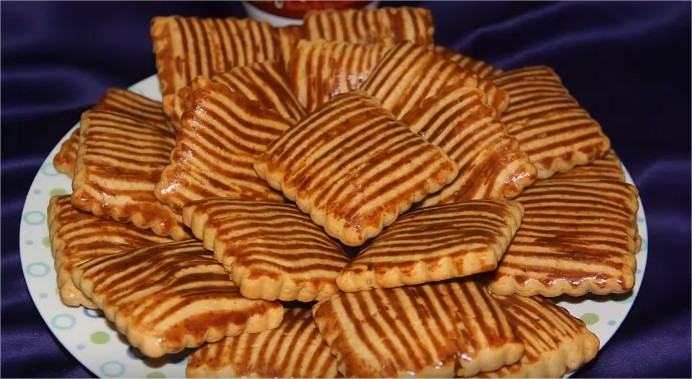 تعمل كرات صغيرة و تبسط، ثم توضع في صفيحة فرن مدهونة بالقليل من الزيت
