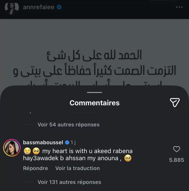 حرصت بوسيل على دعم الرفاعي بشكل علني، حيث علقت على منشورها الأخير بكلمات دافئة: “قلبي معاكي وأكيد ربنا هيعوضك بأحسن أنونة”، في رسالة تضامن إنسانية تخطت الحدود الجغرافية.