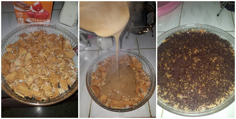 4 بكيات بيمو صابلي او هنريس قطعتهم وجمعتهم بكاس دانون وفرشت في المول وفي كاسرونة نصف لتر حليب 2 معالق كريم باتسيير، 3 معالق سنيدة فوق العافية نحرك الخليط ونزيد عليه 2 صاشي نسكافيه مني يعقاد الخليط نكبو فوق البيمو اللي فرشت في المول وندخل المول الثلاجة يبرد من بعد نزوق بفيرميسيل شكلاط جربوها جات بنننننينة.