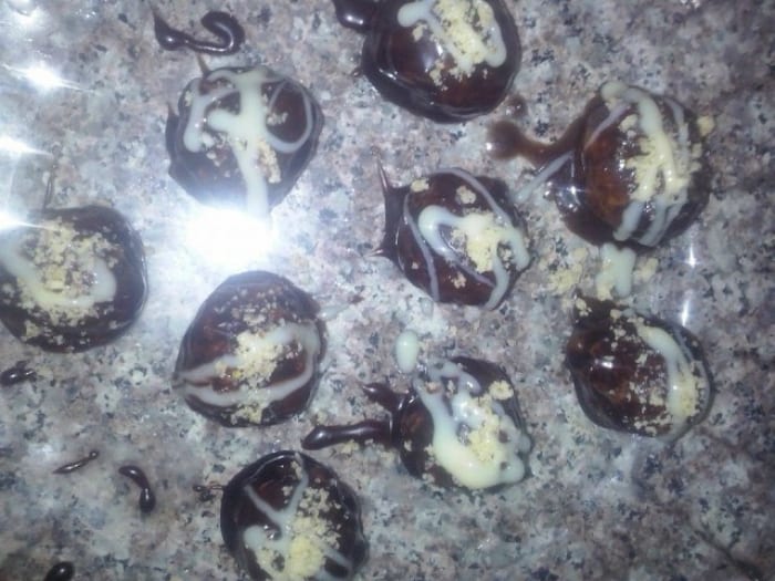 ونصنع كويرات ونغلفها بالشكلاطة ونرش كاوكاو او لوز مهرمش ونزينها بالكراميل وتوضعها فالثلاجة
