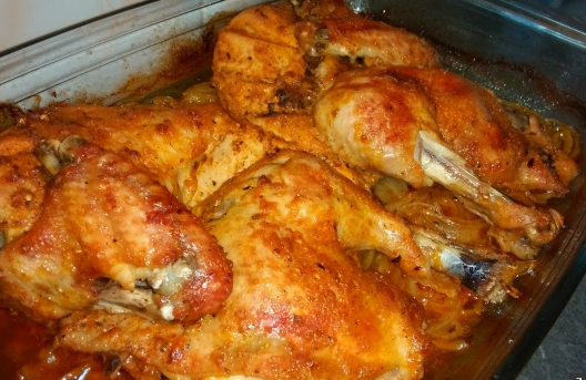 ملعقة صغيرة من الثوم بودرة،قومي بمزج المكونات ثم تبلي قطع الدجاج جيدا،بعد ذلك توضع في المول الخاص بالفرن مع شرائح البصل،يدخل الدجاج الى الفرن لمدة 45 دقيقة ثم يقدم ساخن بالصحة والراحة.