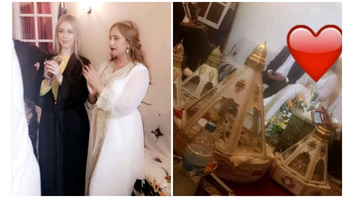 وحرصت مريم على الاحتفال بخطوبتها وسط أجواء وعادات وتقاليد مغربية رائعة، وارتدت قفطانا لونه ابيض وبه نقوشات ذهبية، مع تاج بسيط على رأسها.