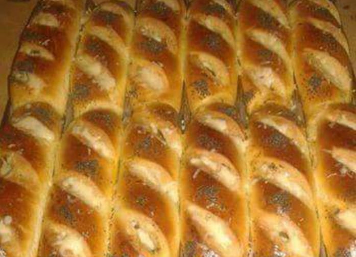 فاش تخمر العجين تقسم كويرات و تبسط كل كرة و تحشى و كتلويها و تترك لتختمر مرة أخرى تم تدهن باصفر البيض تفليهم و تزين بالبافو او الجنجلان و الى الفرن مباشرة.