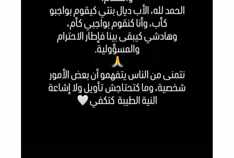 وأضافت في رسالتها التي اتسمت بالوعي والنضج: “راه الحياة اختيارات وكل واحد منا اختار الطريق اللي كيشوف فيها الراحة والسلام”، في إشارة إلى أن القرار كان نتاج تفكير عميق واتجاه كل منهما لمساره الذي يراه مناسباً لتحقيق السلام الداخلي.