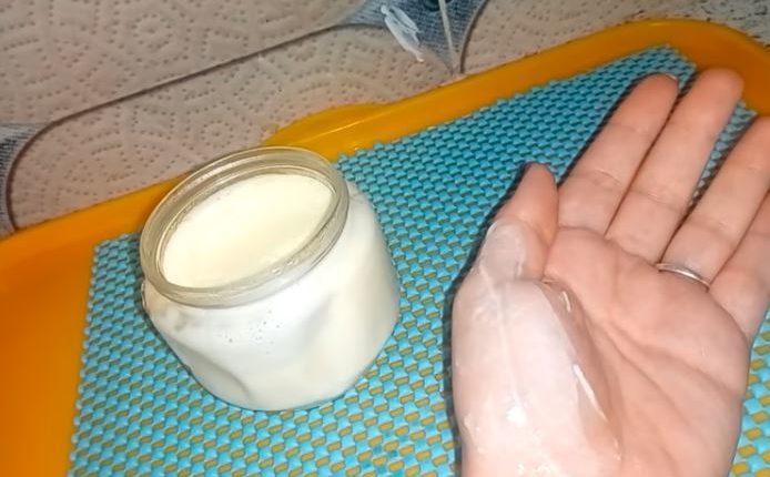 في وعاء نذيب الحليب المايزينا ثم الصابون نضيف باقي المكونات ونضعه على نار هادئة حتى نحصل على كريم متجانس نضعه في قنينة ونحتفظ به حتى مدة شهر.