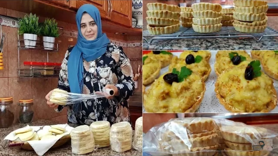 الطريقة: نعجن العجين نتركه يرتاح نشكله ونطهيه قليلا نحضر الحشوة ونملئ بها الكيش ندخلها الفرن