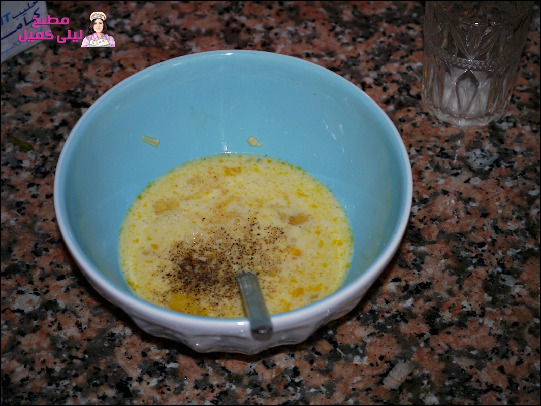 في ايناء نضرب البيض مع الحليب الجبن ونضيف له القرع والسبانخ ونخلط