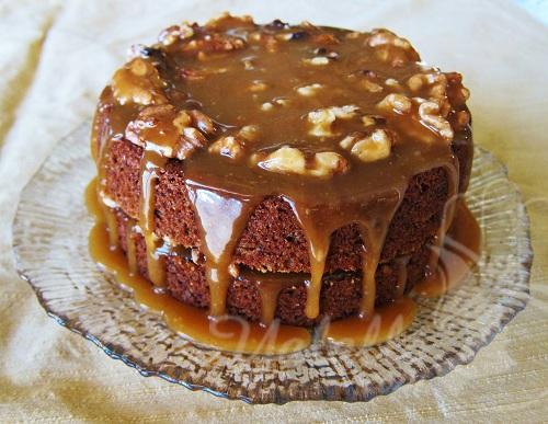 10- لتزيين الكيك، نسكب الصلصة على وجهه، ثمّ نوزّع حبات جوز البقان الكاملة فوق الصلصة.