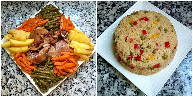 نأخد كمية من الأرز طويل الحبة نغسله و نصفيه ثم نضعه في الماء الذي بقي لنا من عملية تبخار اللحم و نضيف له القليل من الجلبانة و فلفلة ألوان مقطعة مربعات و حبتين هيل و حبتين قرنفل و شووية من توابل المروزية ثم تقفل عليه و نتركه يطهى و يجف من الماء و تقدمه مع باقي الاطباق.. و بالصحة