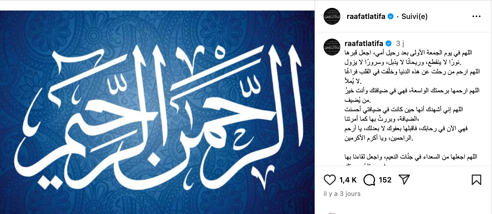 كتبت لطيفة في منشور طويل: “اللهم في يوم الجمعة الأولى بعد رحيل أمي، اجعل قبرها نورًا لا ينقطع، وريحانًا لا يذبل، وسرورًا لا يزول، اللهم ارحم من رحلت عن هذه الدنيا وخلّفت في القلب فراغًا لا يُملأ”.