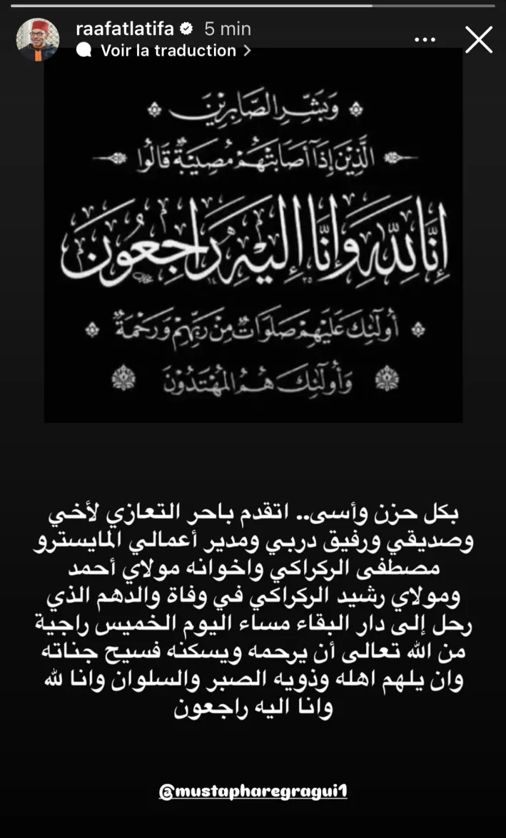 توجهت الفنانة المغربية لطيفة رأفت إلى صديقها ومدير أعمالها المايسترو مصطفى الركراكي، بعزاء مؤثر في وفاة والده رشيد الركراكي الذي وافته المنية مساء الخميس.