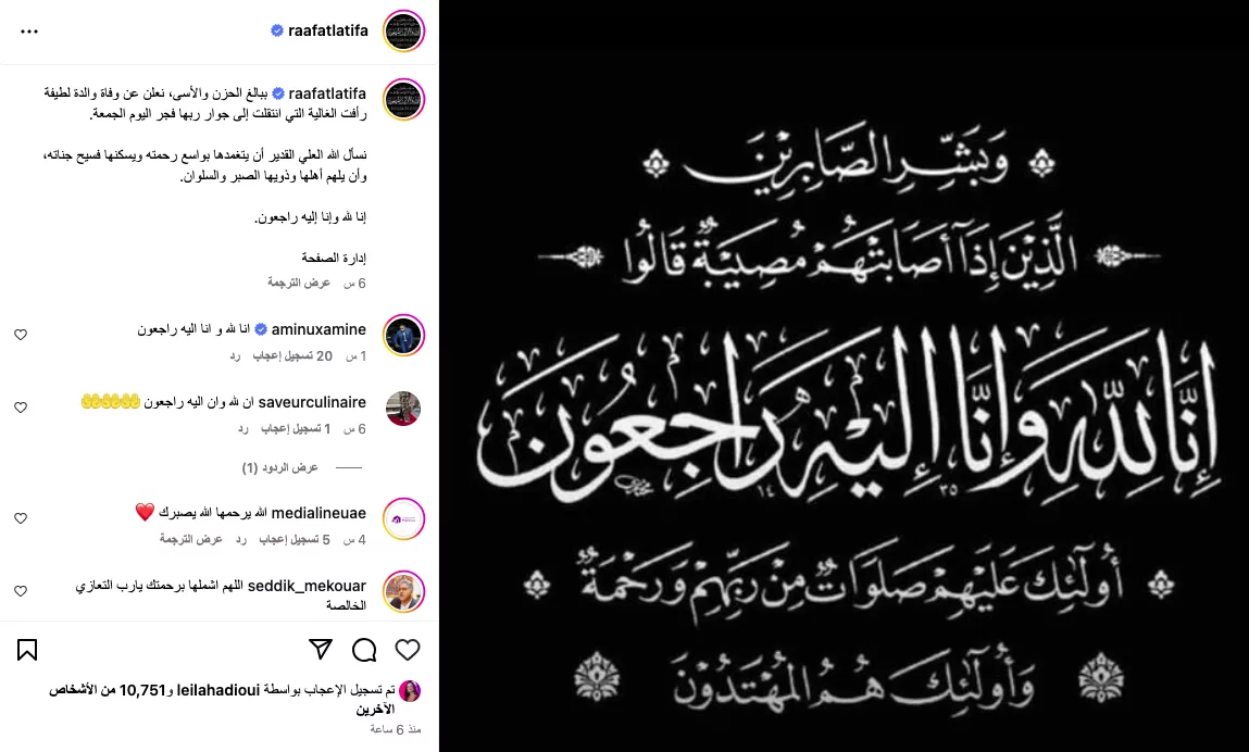 نعت الصفحة الرسمية للفنانة المغربية لطيفة رأفت عبر “إنستغرام” وفاة والدتها التي وافتها المنية فجر يوم الجمعة، في خسارة مؤلمة تسببت بحزن عميق لمحبي الفنانة داخل المغرب وخارجه.