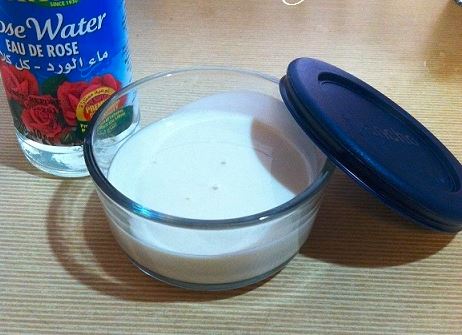 حوالي كوب و نصف من الماء البارد مضاف إليه حوالي 3 ملاعق طعام من ماء الورد