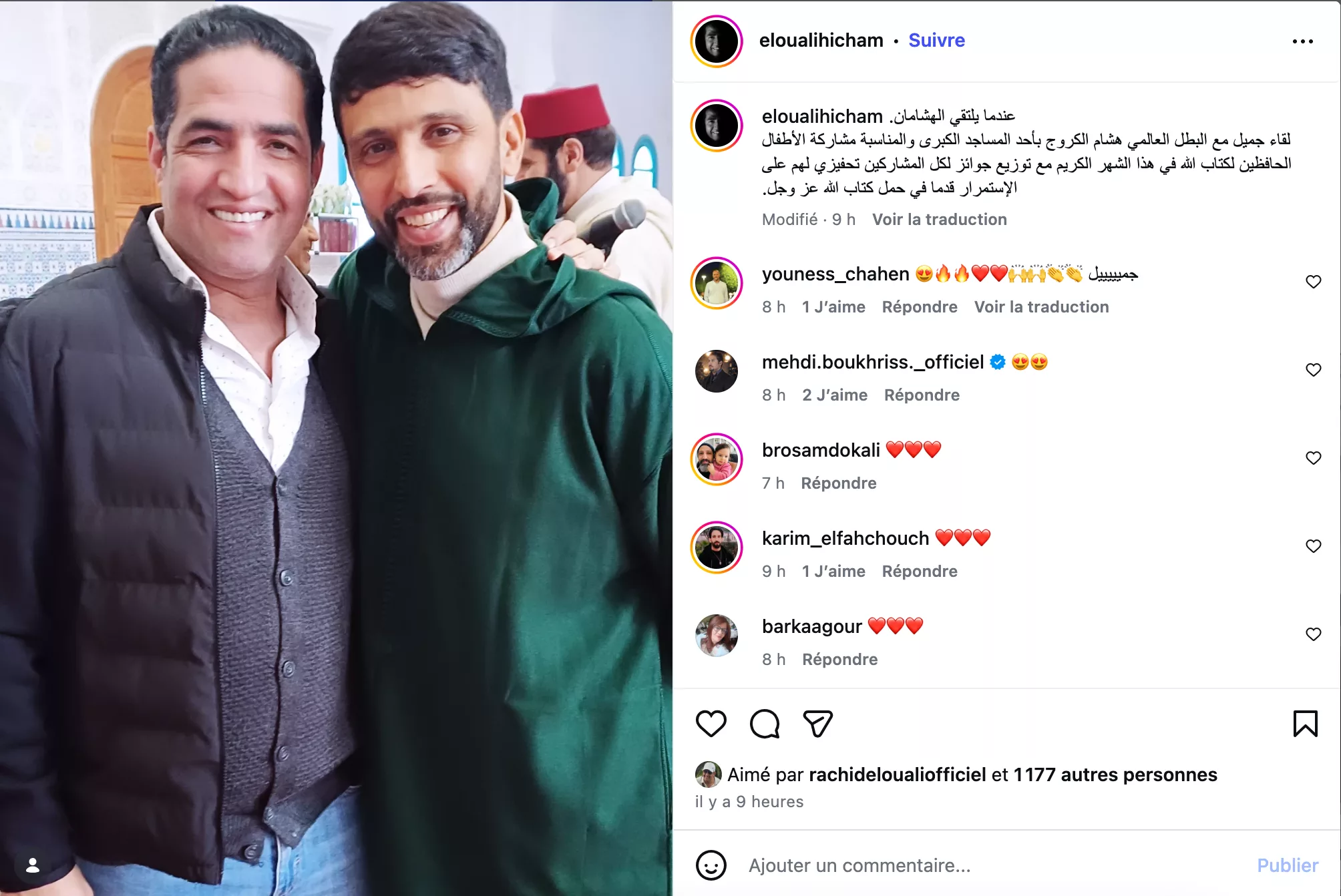 بفخر وامتنان، شارك الممثل المغربي هشام الوالي متابعيه على إنستغرام لحظة مميزة جمعته بالعداء العالمي السابق هشام الكروج، وذلك خلال لقاء رمضاني داخل أحد المساجد الكبرى، ضمن فعاليات تكريم حفظة كتاب الله.