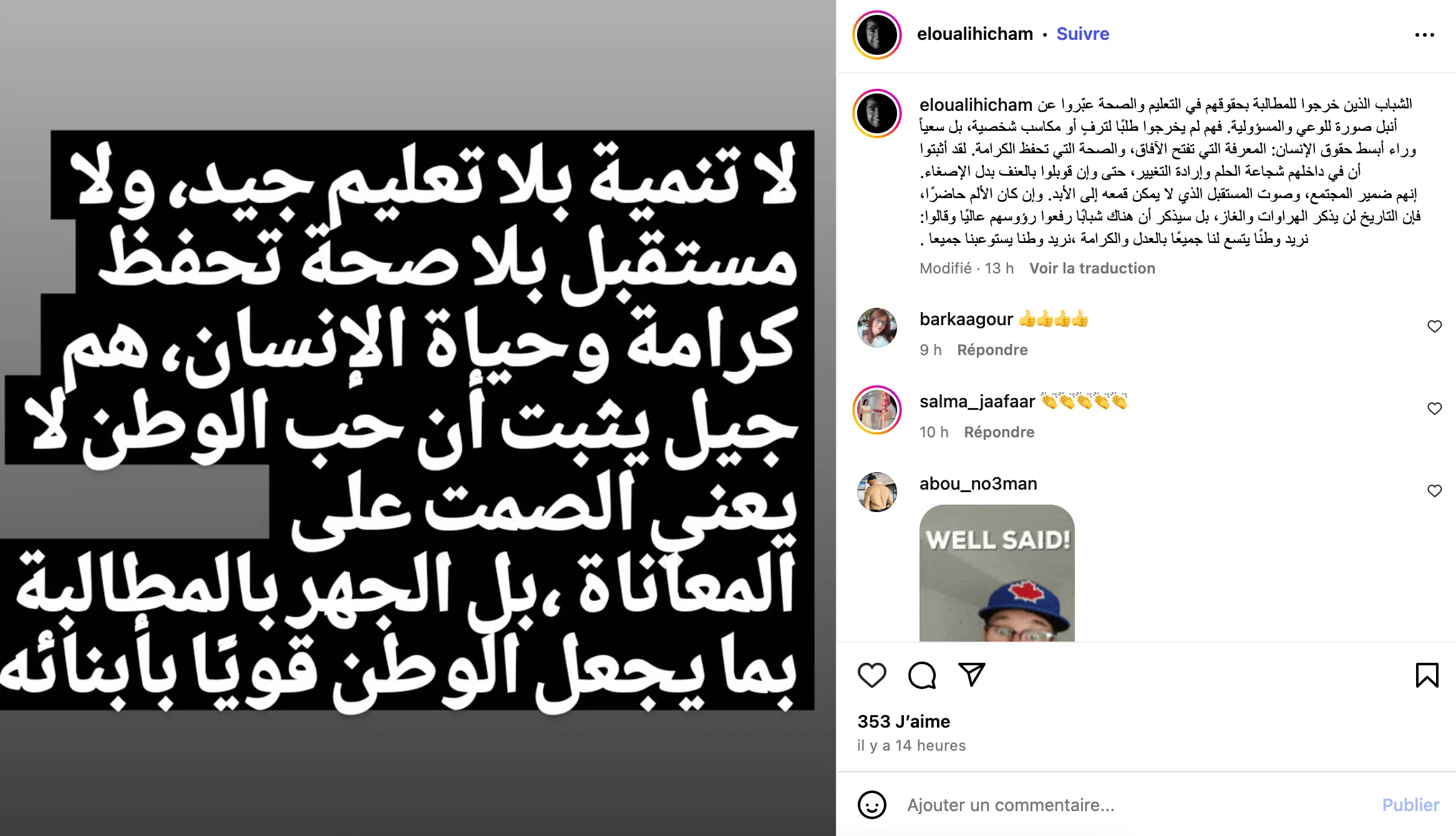 بكل شجاعة ووطنية، تناول الممثل المغربي هشام الوالي قضية التظاهرات الأخيرة التي خرجت للمطالبة بحقوق أساسية في مجالي الصحة والتعليم، معبراً عن دعمه الكامل للشباب المتظاهرين.