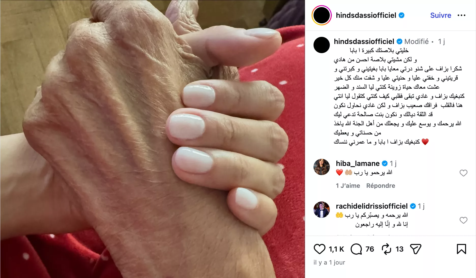 نشرت الفنانة المغربية هند السداسي تدوينة مؤثرة عبر حسابها على إنستغرام، نعت من خلالها والدها الراحل الذي وافته المنية قبل أيام، معبرة عن عمق الفاجعة التي ألمت بها.