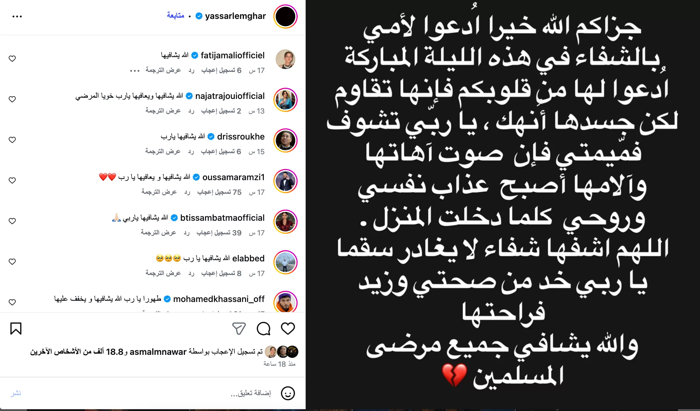 أثار الفنان المغربي يسار المغاري تفاعلاً واسعاً عبر مواقع التواصل الاجتماعي، بعد نشره رسالة مؤثرة دعا فيها متابعيه إلى الدعاء لوالدته التي تمر بوعكة صحية.
